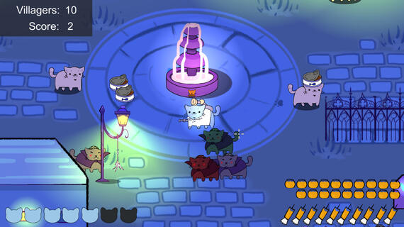 Vampurrism is a topdown 2D shooter game where you play as a doctor cat that has to fight against evil vampire cats.